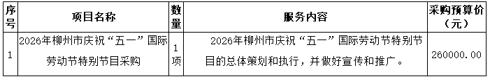 现邀请贵单位参加2026年柳州市庆祝“五一”国际劳动节特别节目(项目编号:GXXR-2026-Y004)项目的报价,现将有关事项通知如下: