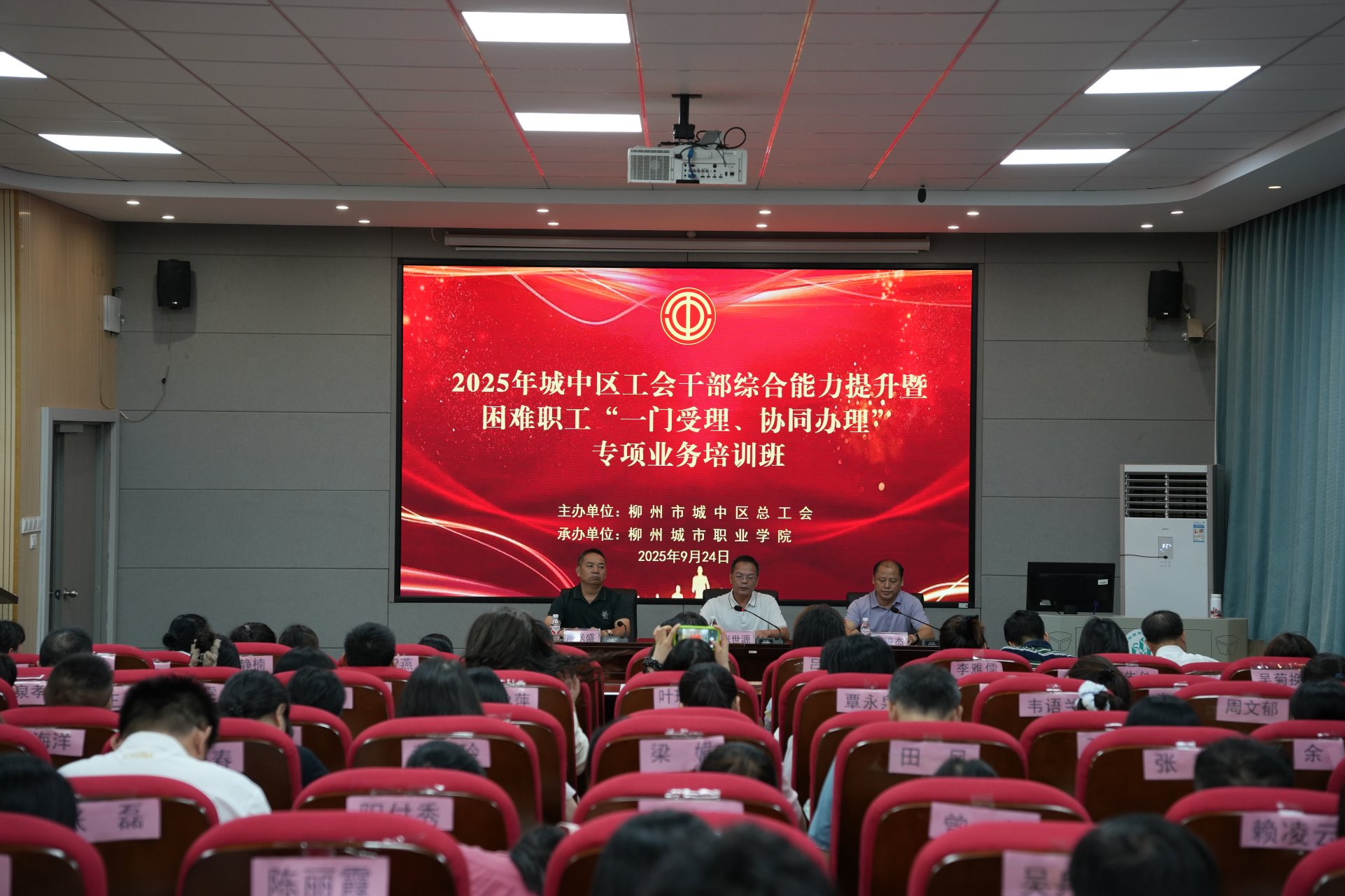 9月24日,2025年城中区工会干部综合能力提升暨困难职工“一门受理、协同办理”专项业务培训班在柳州城市职业学院开班。城中区人大常委会党组副书记、副主任,城中区总工会主席张世源出席开班仪式并讲话。城中区潭中街道工作委员会委员、书记,城中区总工会副主席唐淳杰主持开班仪式。城中区总工会党组成员、副主席周米盛,城中区总工会“三委”委员,以及来自辖区基层工会的干部、财务人员和业务骨干共127人参加培训。