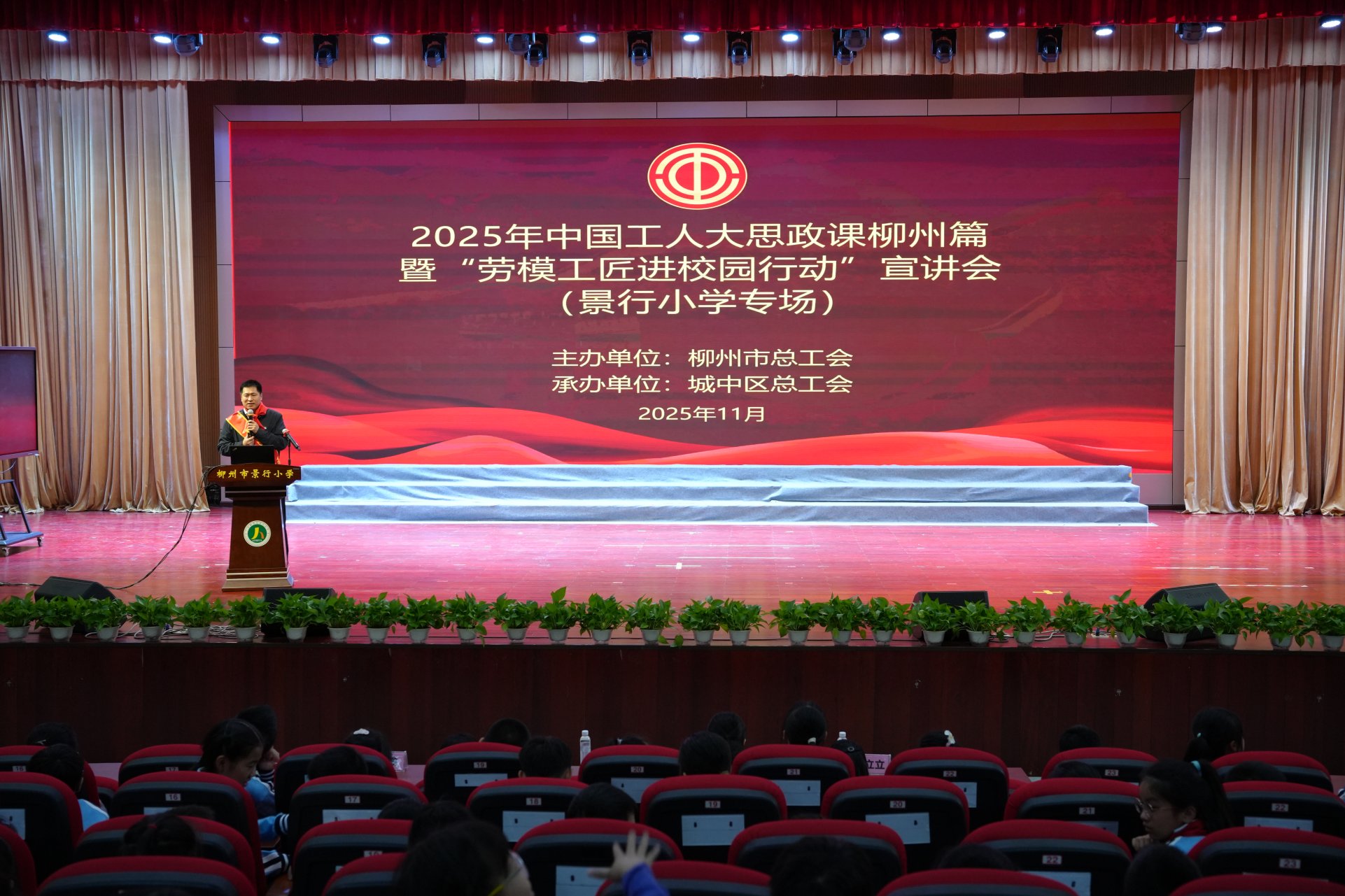 11月5日上午,柳州市景行小学的综合艺术馆里掌声雷动、笑语盈盈,由柳州市总工会指导、城中区总工会主办的2025年“柳州产业工人大思政课”暨“劳模工匠进校园”宣讲活动在柳州市景行小学成功举行,该校660余名师生代表共同参与本次活动。全国劳动模范、“大国工匠”、广西柳工机械股份有限公司传动件公司制造总监庞淇文,带着满身“技能光环”和一线奋斗故事,以特别“老师”的身份,为孩子们带来了一场关于成长、坚守与梦想的生动分享,让敬业、精益、专注、创新的工匠精神在校园里深深扎根。