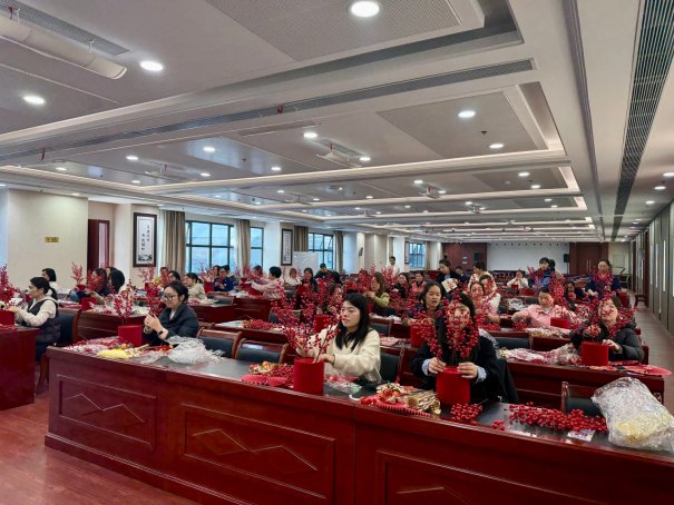 本次活动由柳东新区(高新区)总工会主办,柳州银行科技支行协办。现场布置温馨喜庆,红果、银叶、灯笼等制作材料整齐摆放。在手工环节,专业老师逐步讲解制作技巧,从花材固定、层次搭配到装饰调整,不一会儿,一束精致饱满的仿真花便示范完成。女职工们兴致勃勃地动手尝试,互相交流帮助,逐渐完成了一束束寓意吉祥、造型美观的作品。
