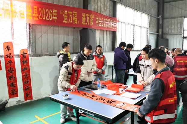 2月6日,三江侗族自治县南站社区职工活动中心内张灯结彩、人头攒动,由县委宣传部、总工会、科协、文联等部门联合举办的2026年“我们的节日・春节”暨“送万福、进万家”文艺惠民志愿服务活动热闹启幕,为社区居民送上满满的新春祝福与文化暖意。