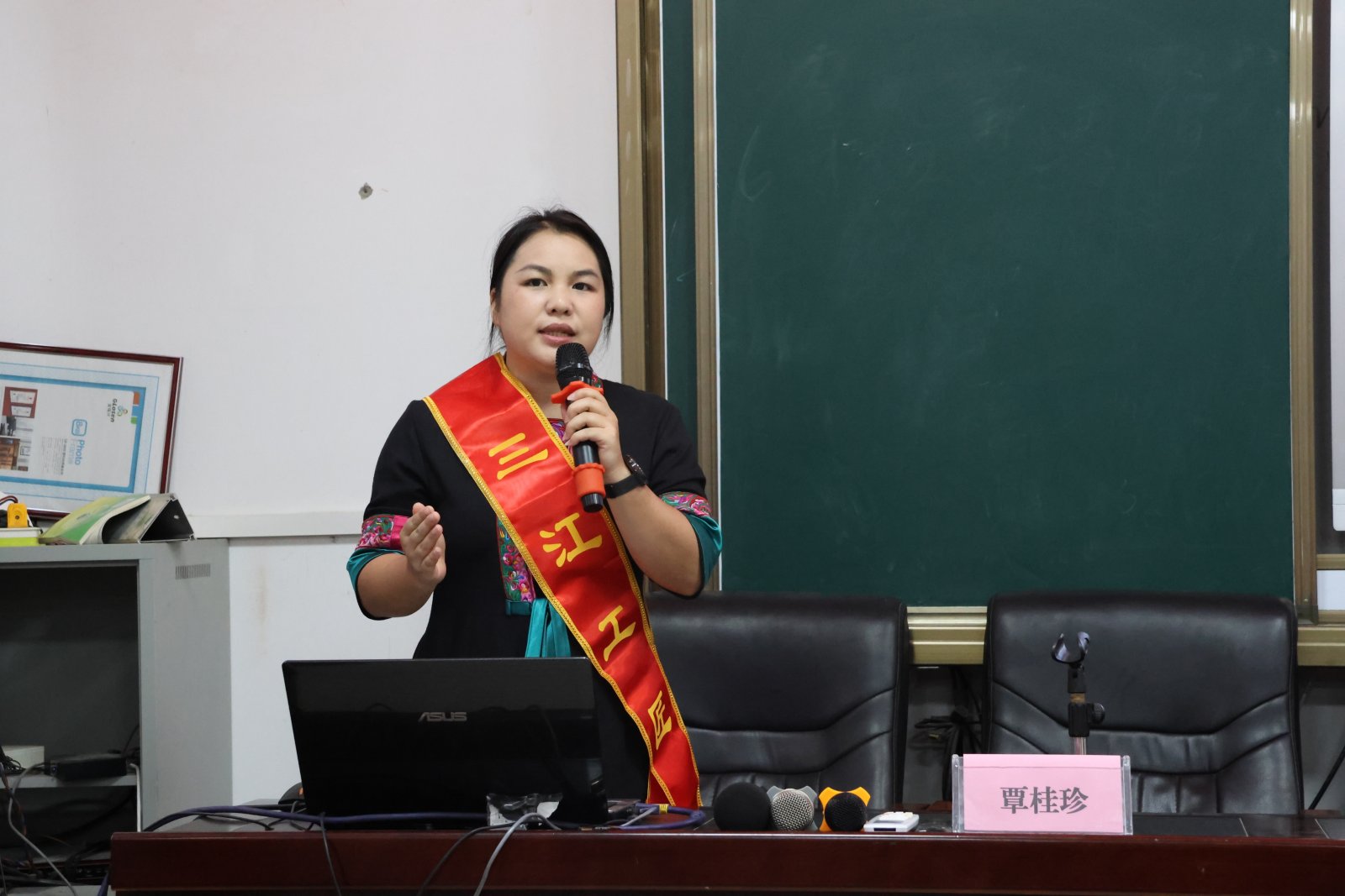 活动中,覃桂珍老师以传承侗族服饰制作技艺为主题,以侗语娓娓道来自己与刺绣的不解之缘。她提到,自幼受母亲熏陶爱上刺绣手艺,大学毕业后毅然接过侗族刺绣家族第5代传承人的接力棒,在县城创办工作室与微车间。为了用新理念突破传统设计瓶颈,她曾为打磨一件精品绣品连续熬夜 40 天;更牵头以“企业+基地+传承人+ 绣娘”模式组建绣坊,带领留守妇女实现家门口就业增收。“把每根丝线穿好、每个针脚绣齐,就是工匠精神。”这句质朴的话语,让孩子们在聆听中真切读懂了“匠心”的内涵。